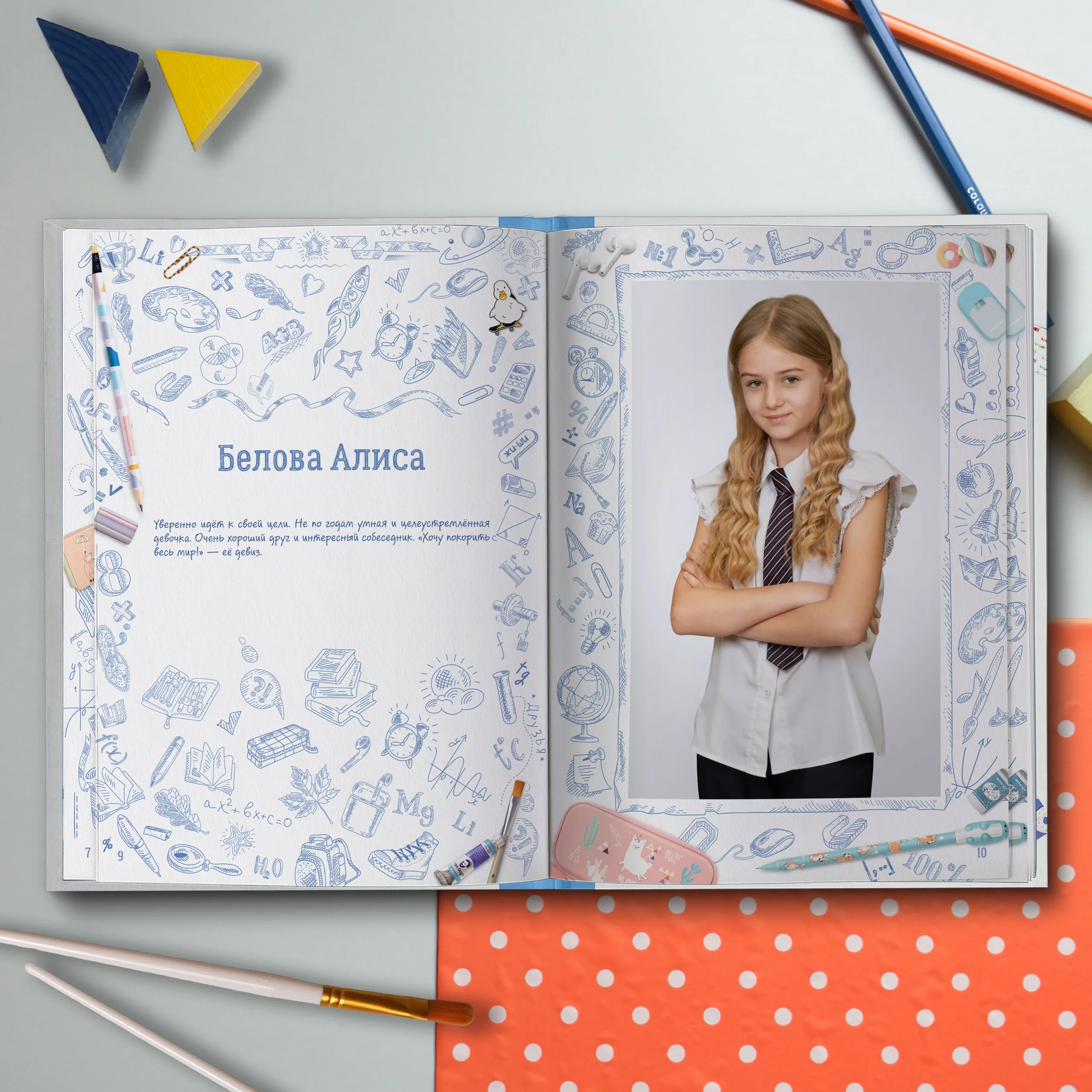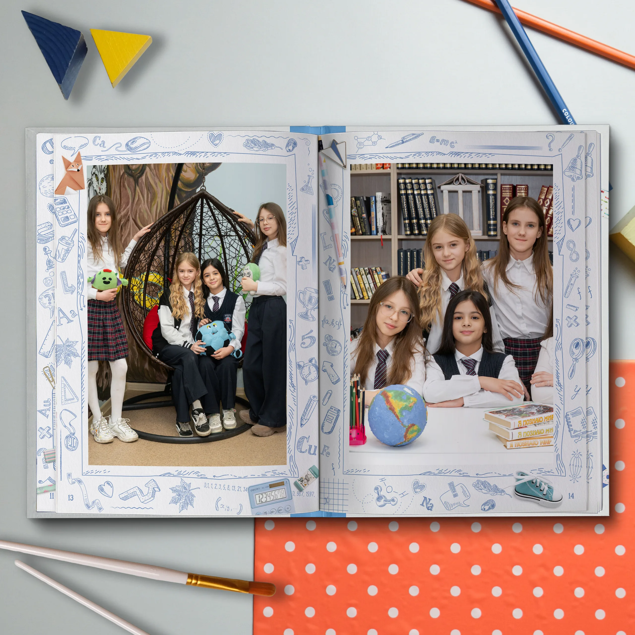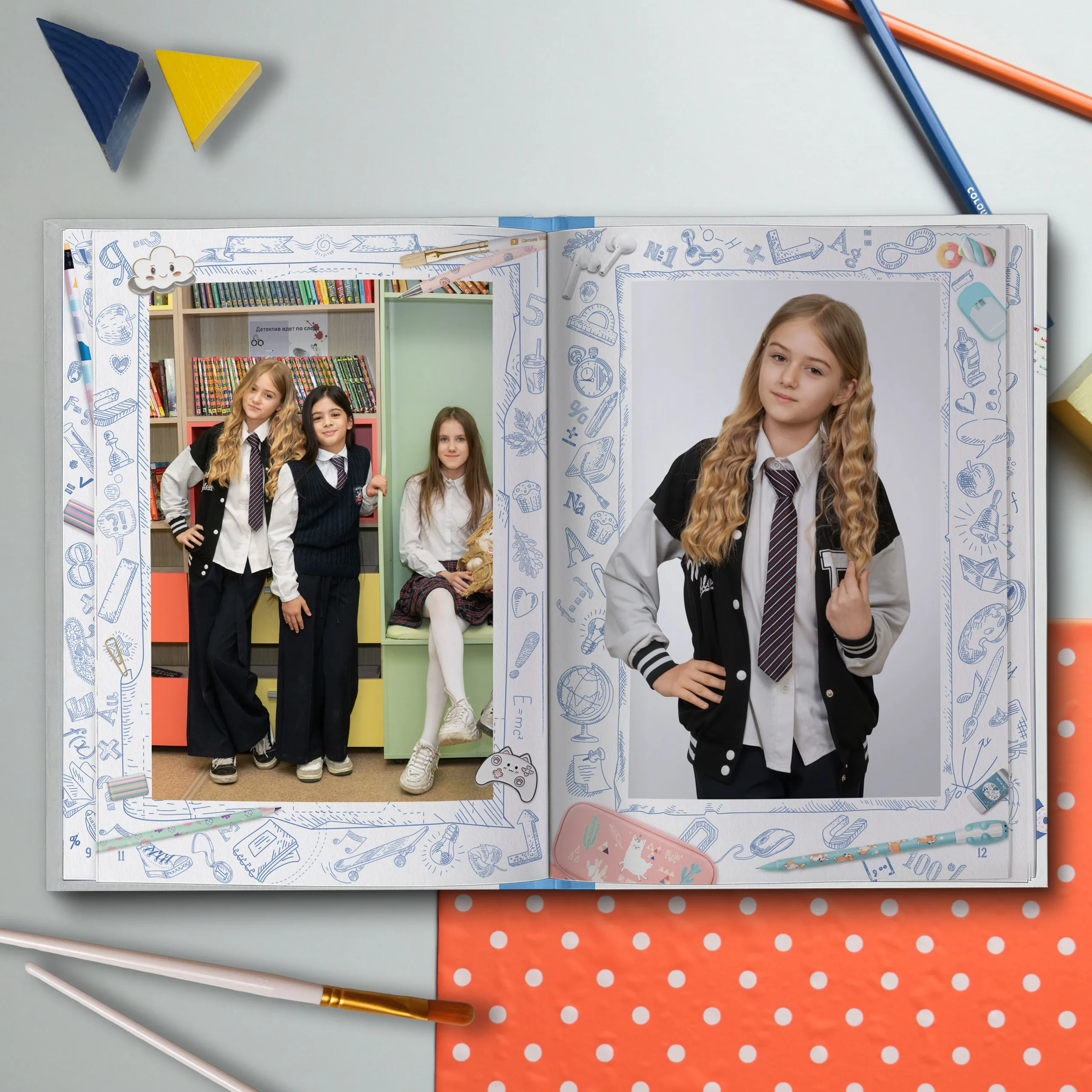 Полюбившийся многим дизайн теперь в светлом оформлении. Яркие кадры юности на фоне, напоминающем изрисованную тетрадь, непременно окунут выпускников в приятные воспоминания. Выпускной альбом в классном современном дизайне не оставит равнодушным ни одного ученика.